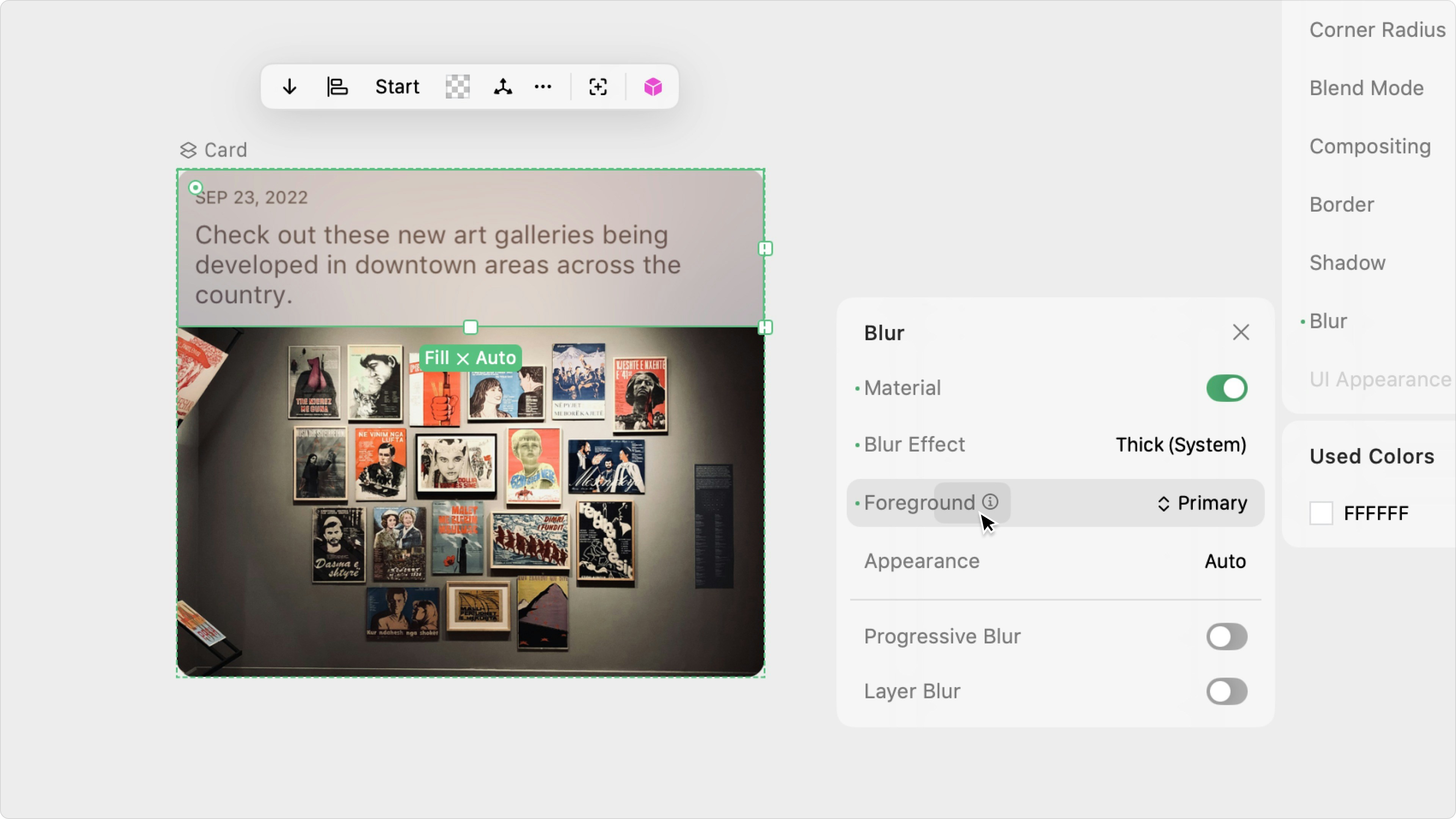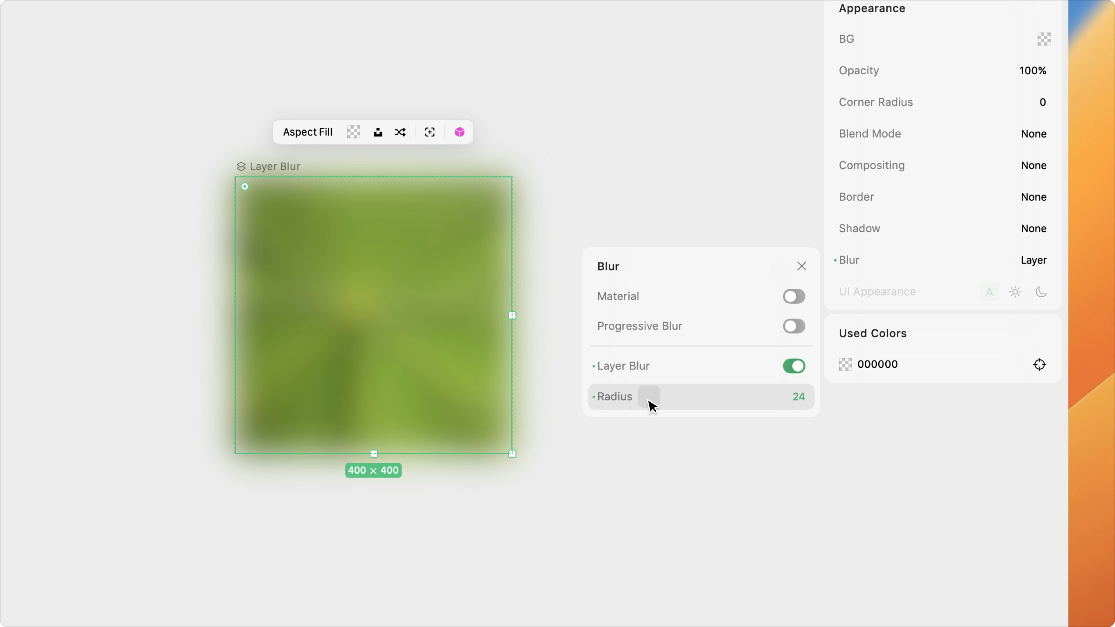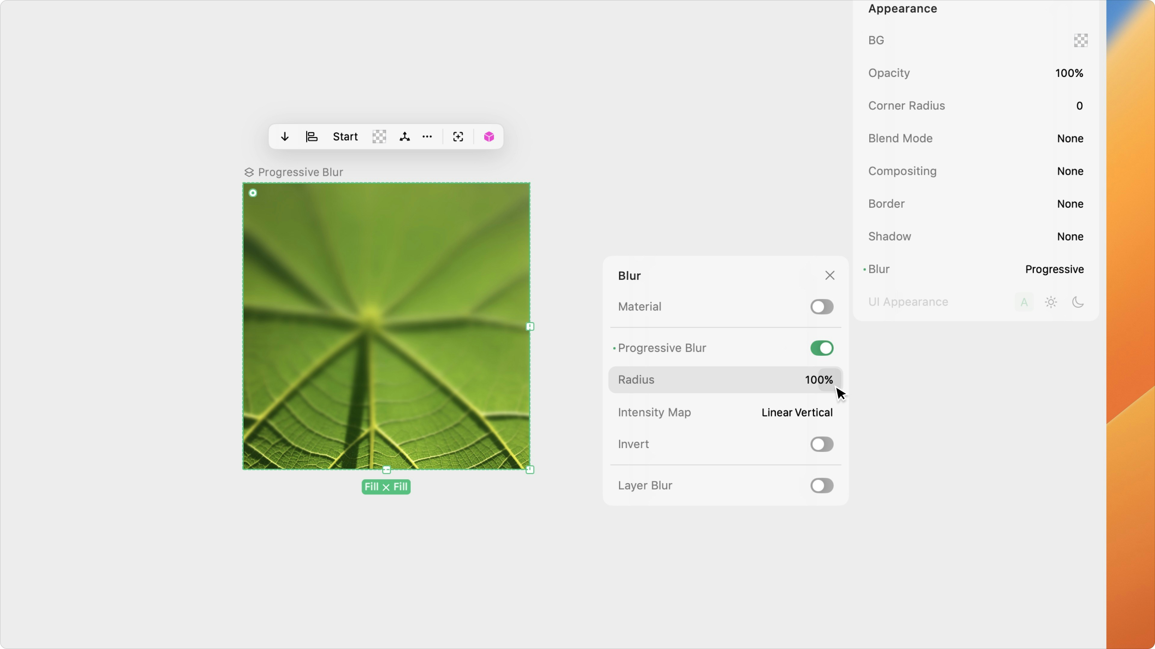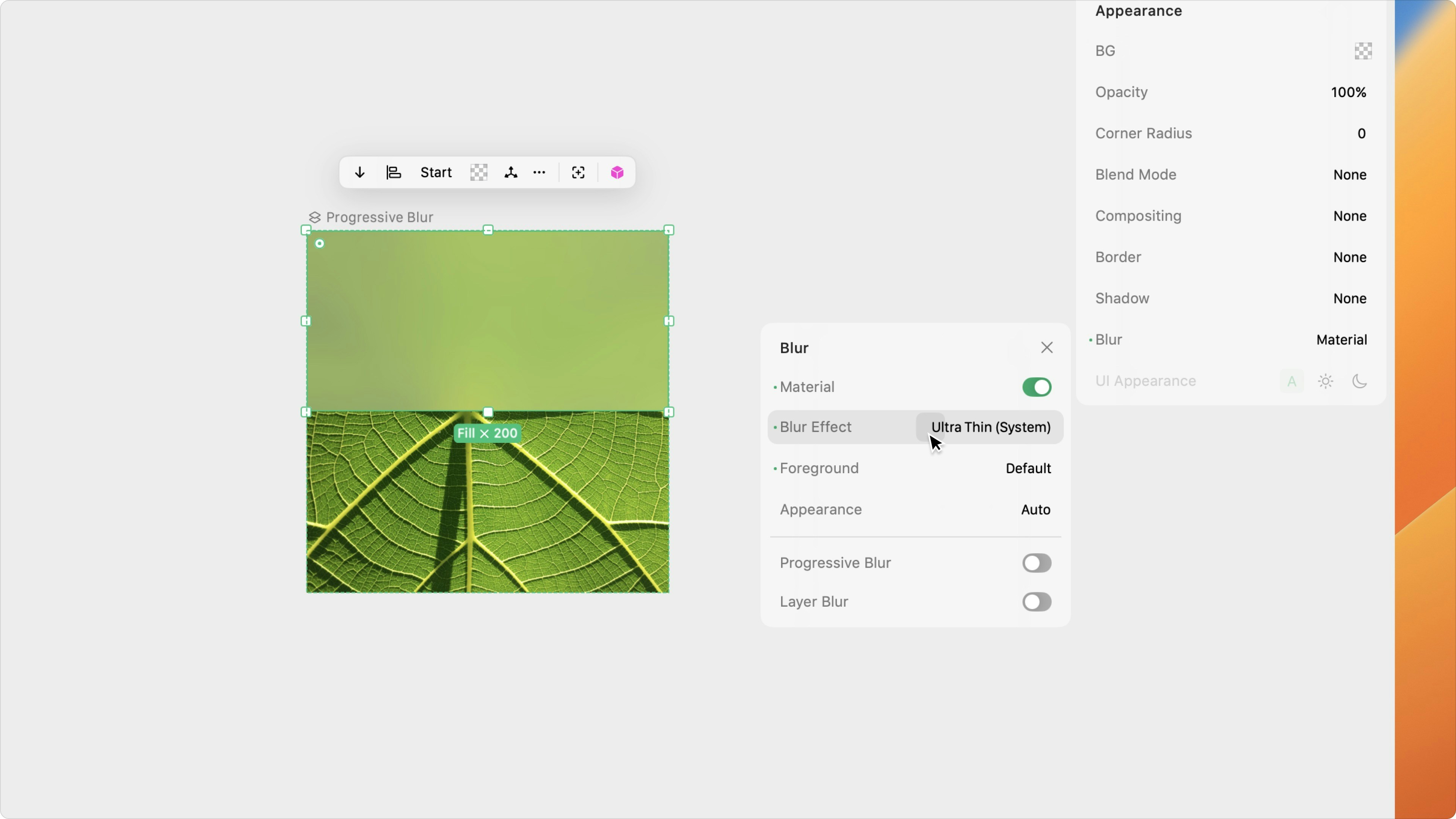 Use the Blur Effect property to select your desired blur from a list of built-in blurs (Extra Light, Light, Regular, Prominent, or Dark) or Apple’s system materials (Ultra Thin, Thin, Regular, Thick, and Chrome).