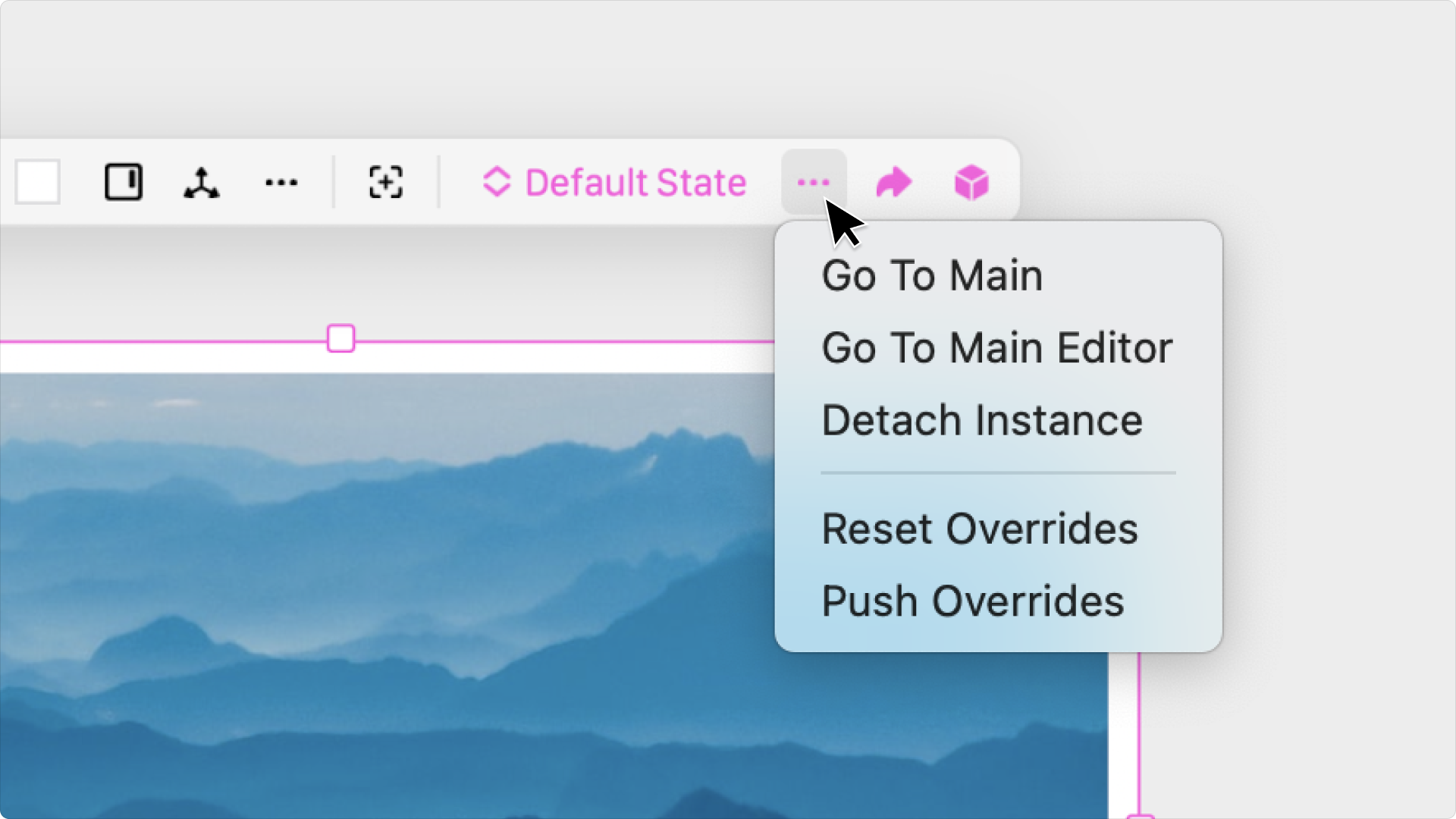 To push all overrides you’ve made to an instance (i.e. update the main component to match this instance), click the pink ellipses icon in the component’s object toolbar to open the overrides menu. Click “Push All Overrides.” All the pink overrides dots will disappear and the main component, along with every other instance of the component, will now match all the properties of this instance.