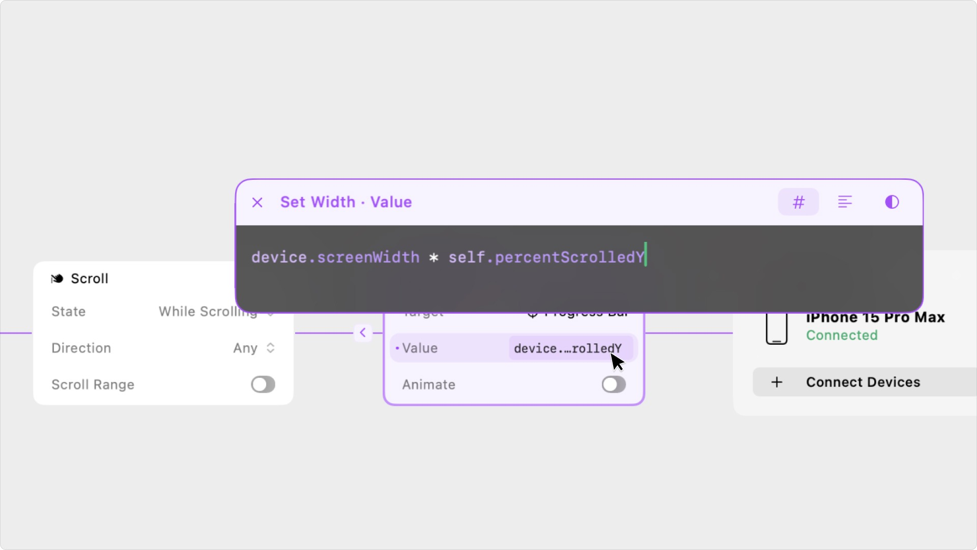 You can access the properties of the iOS device the prototype is currently being viewed on through the Expression Editor. You can use these properties in equations, conditional statements, and functions to make prototypes responsive.Accessing Device Properties