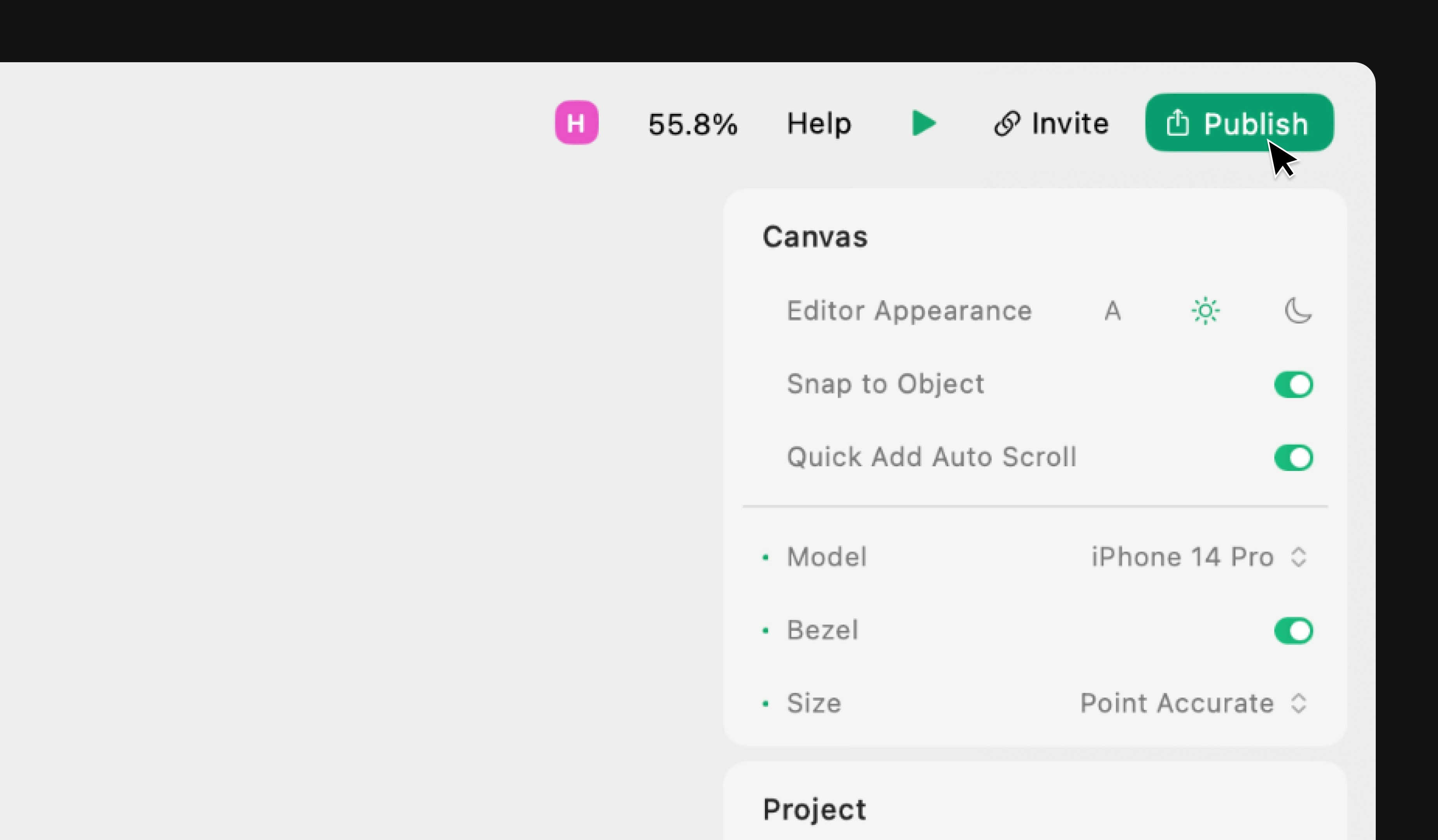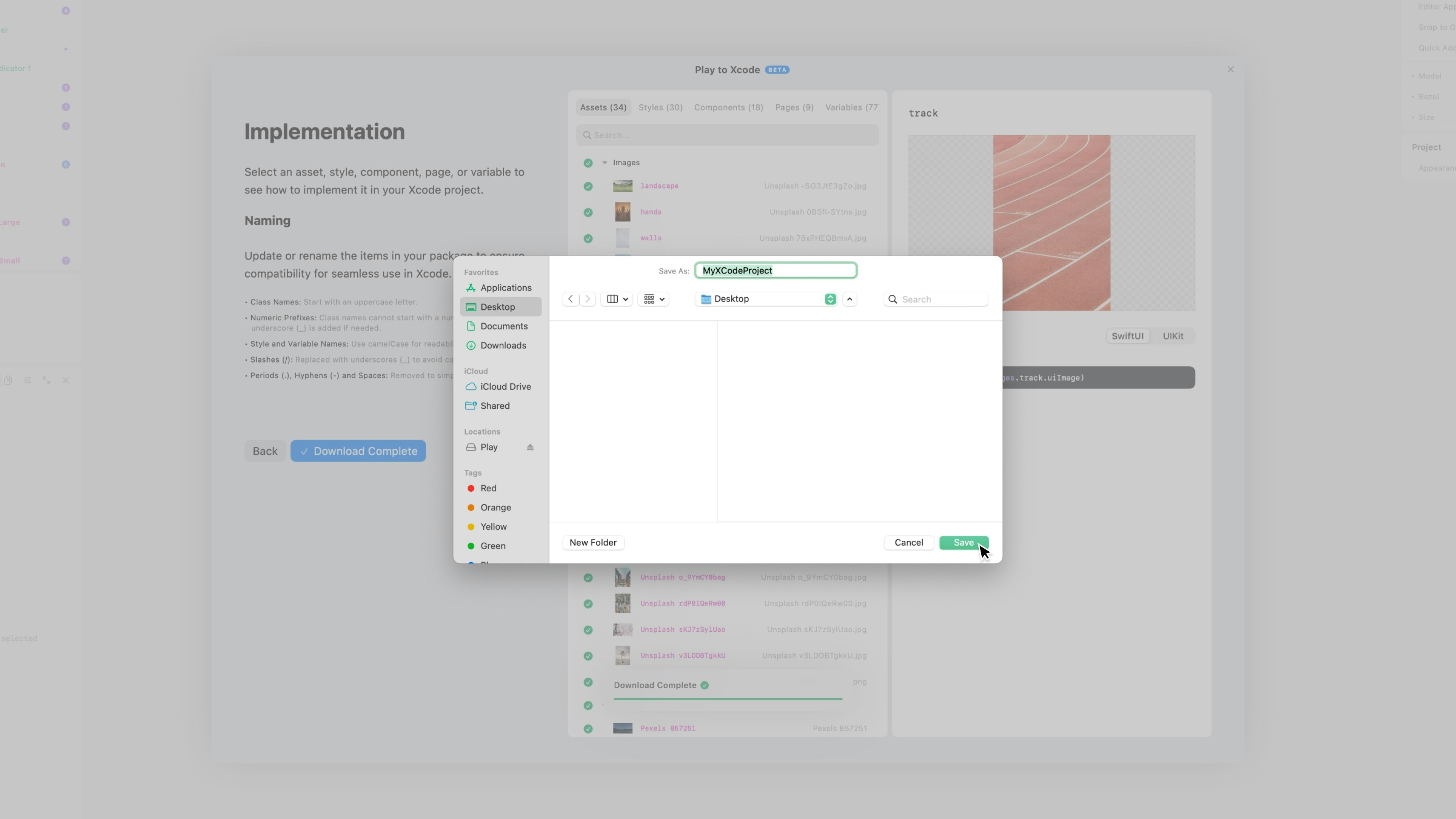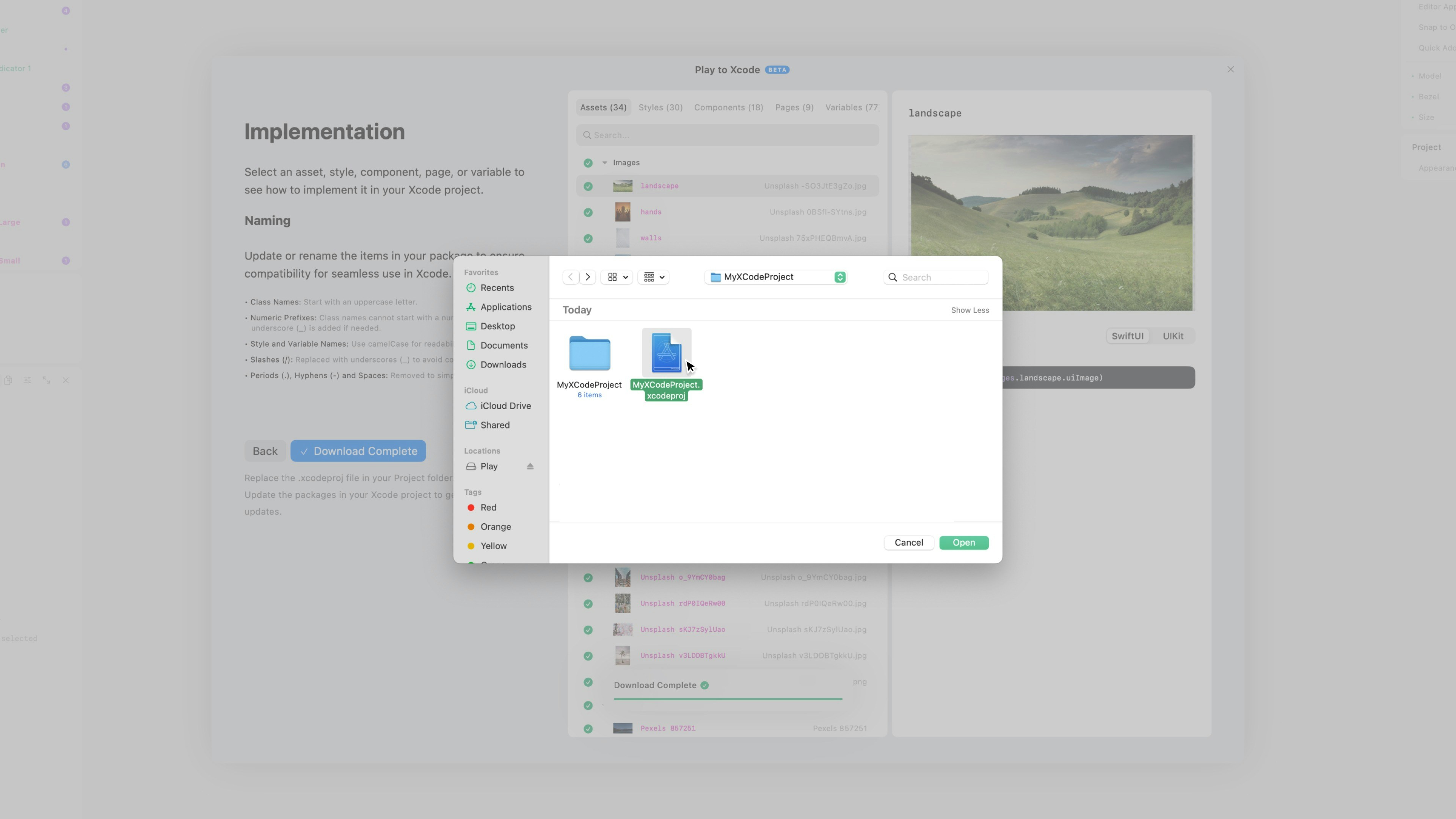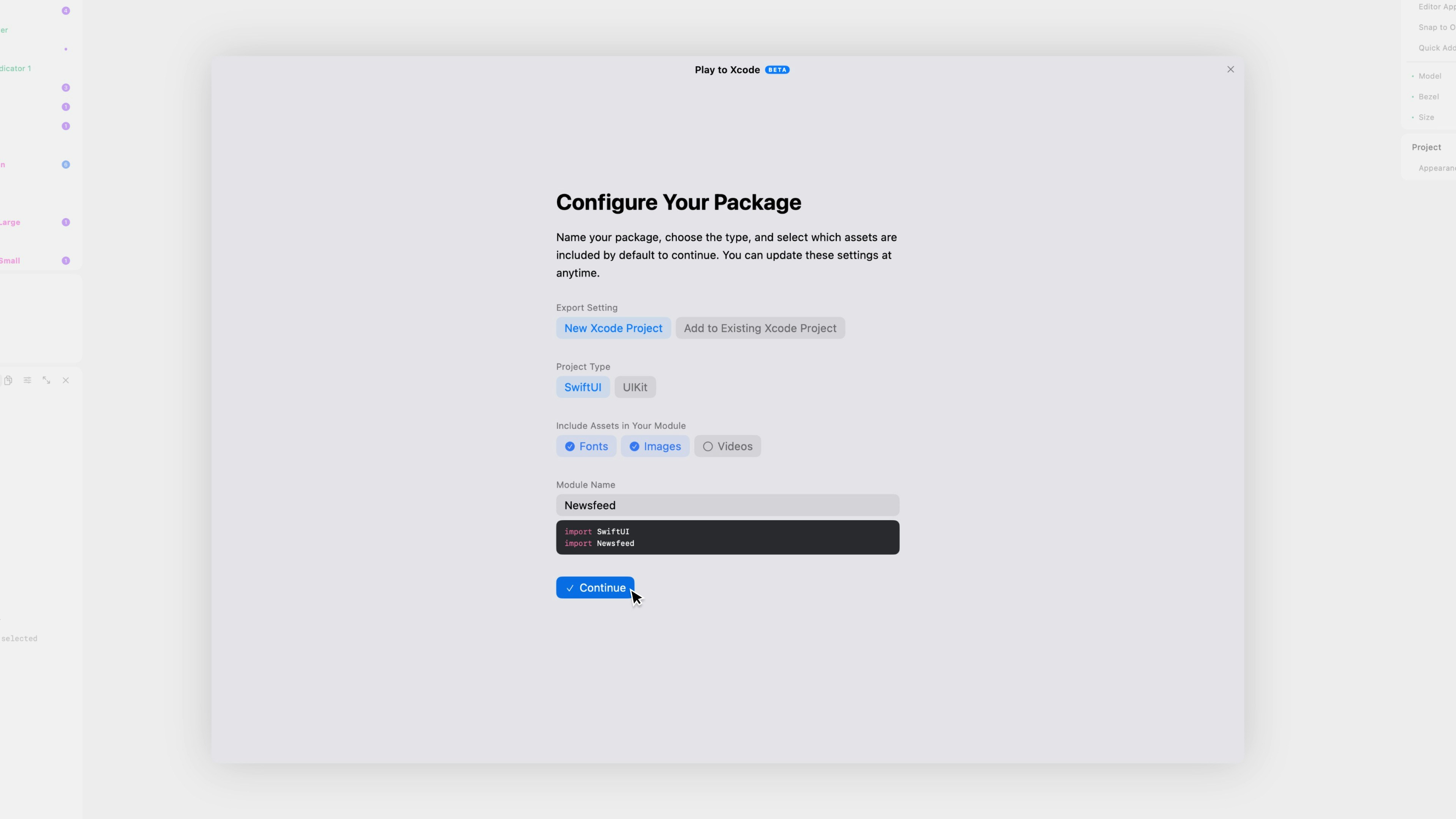With Play to Xcode, your Play project is no longer just a prototype. You can use Play’s SDK (software development kit) to export your project’s styles, assets, components, pages, and variables directly into Xcode as a Swift package. Everything will look and behave 1:1 with how you designed it in Play. You can add the Swift package to a new or existing project in Xcode, and you can always update the package based on new changes in Play. We’re making it easy to keep your design tool and code base in sync.Note: Play to Xcode is only available on Pro & Enterprise plans.Components, pages, and variables each count as an “item” in the export. Assets and styles are included in the export and do not count as items.