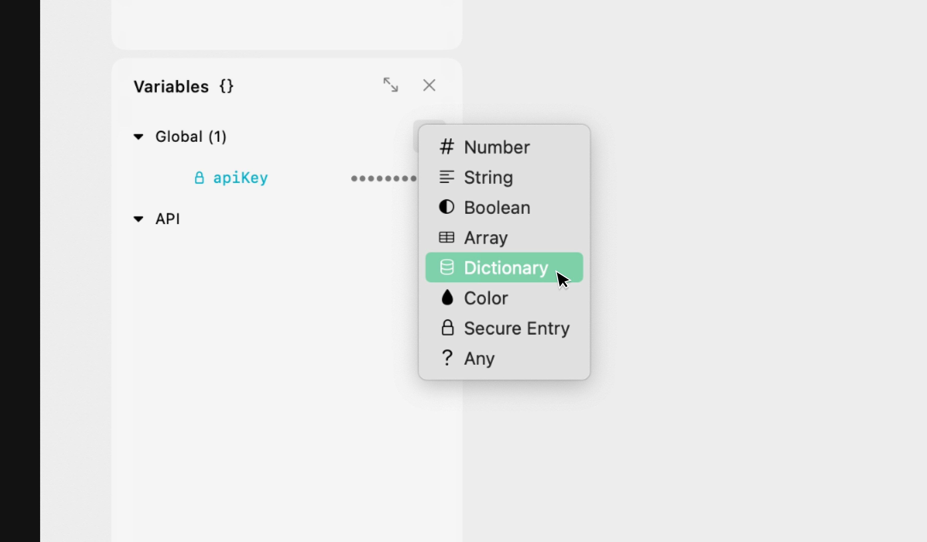 We recommend saving the response as a dictionary variable, so you can use it throughout your project and avoid casting the API/JSON response as a dictionary. A dictionary variable stores the entire API or JSON response with the data structured in key-value pairs. You’ll create a dictionary variable from the Variables Panel.