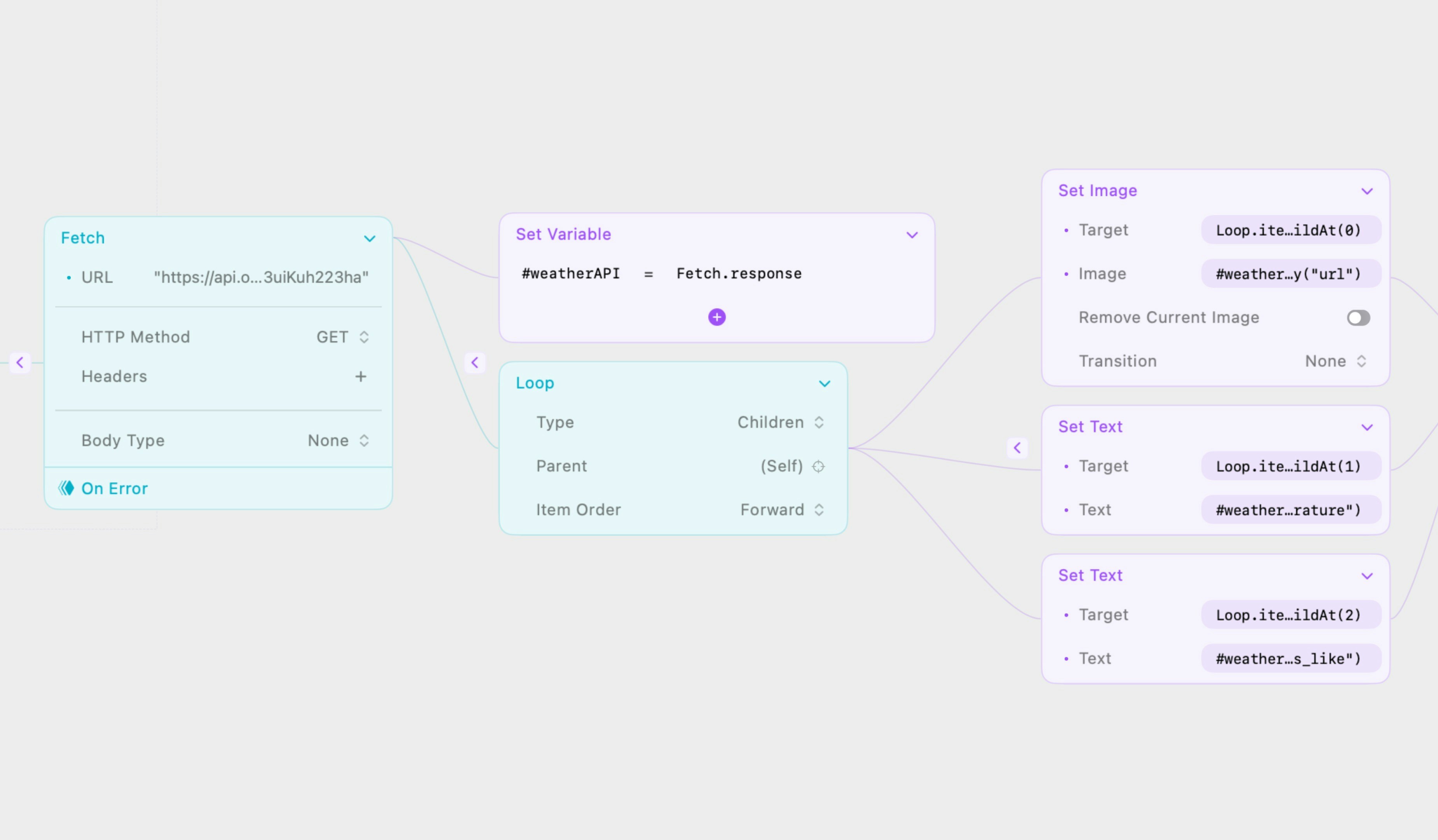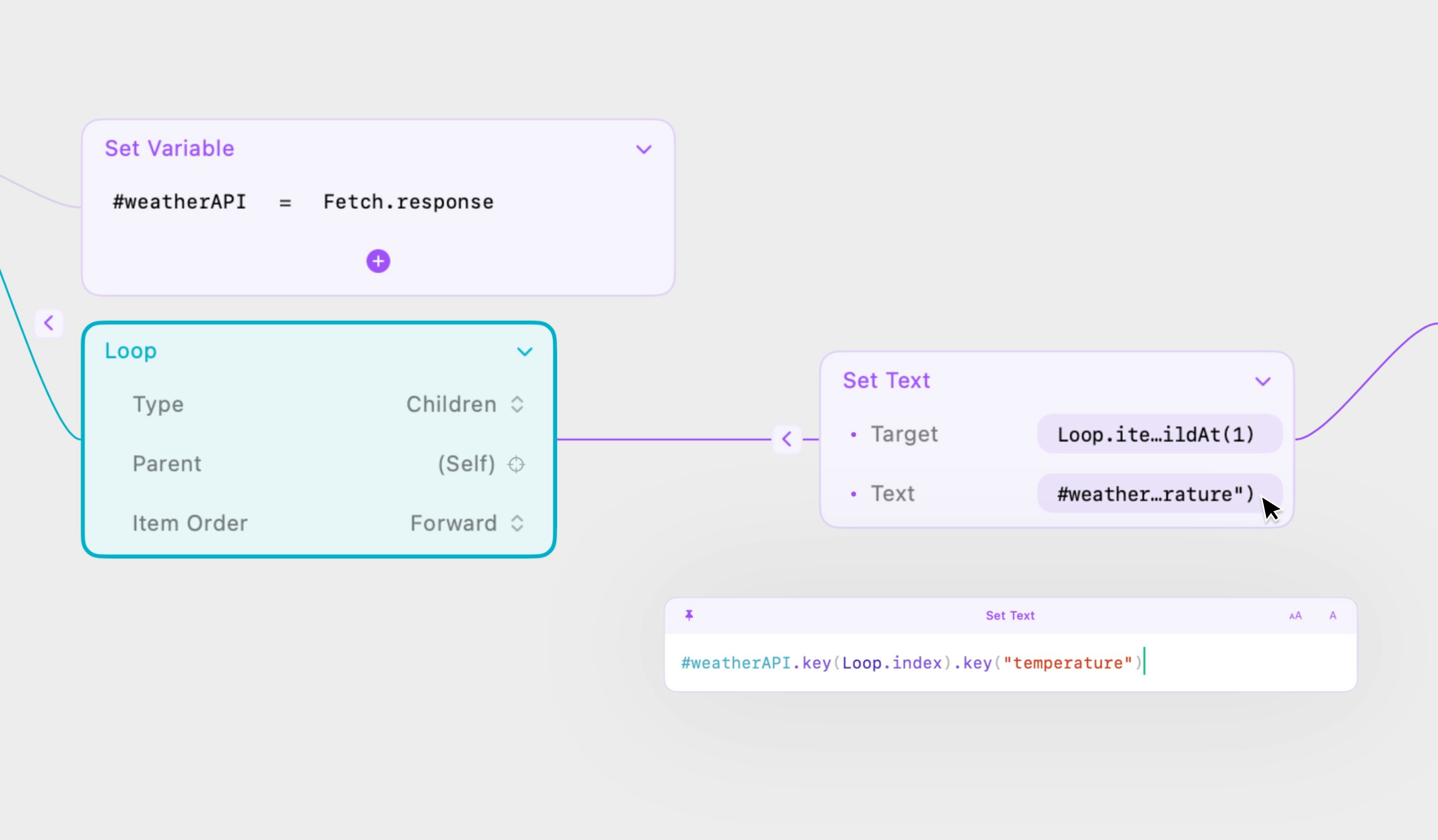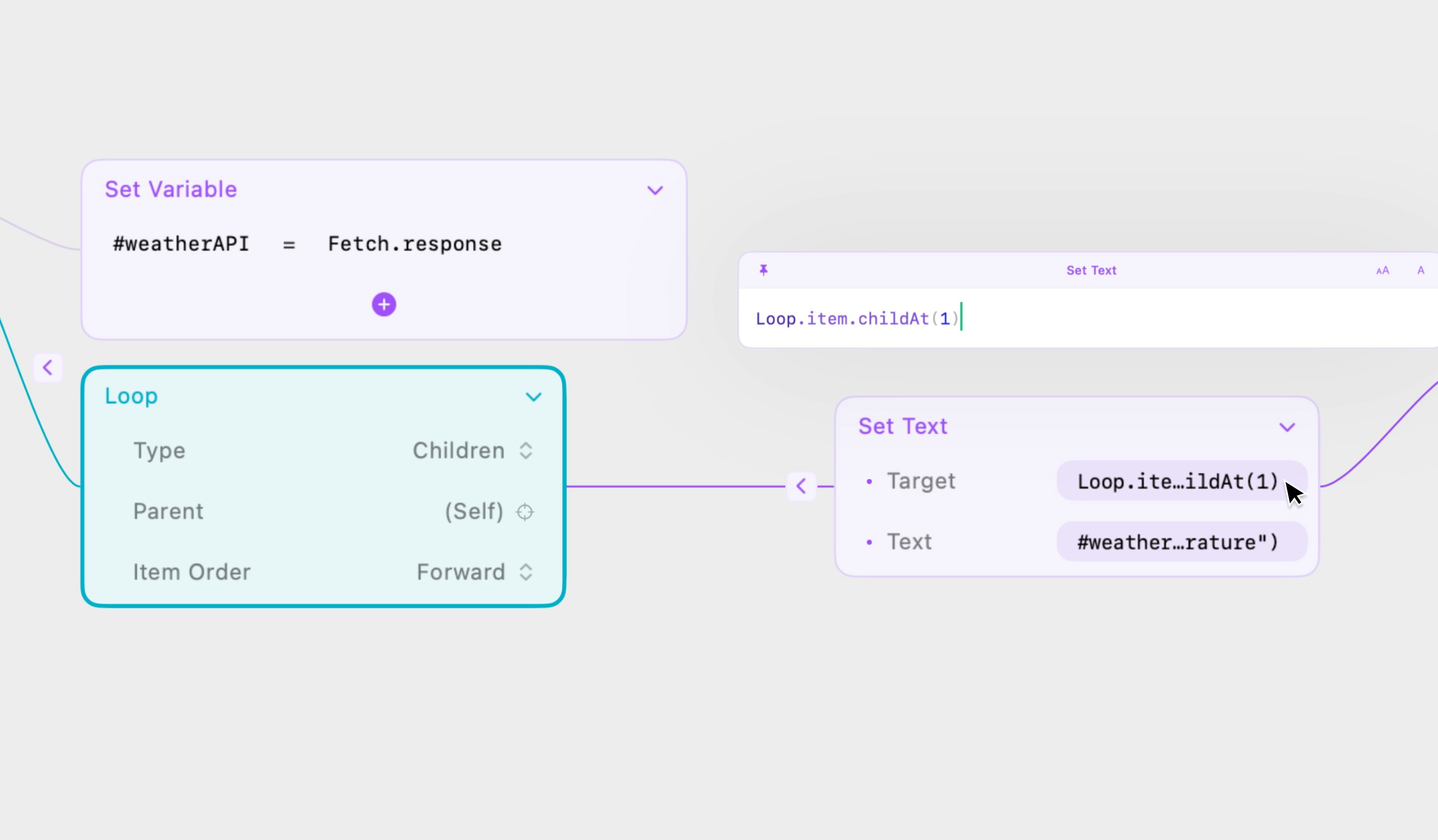 This example uses the Local JSON node, but you could use Fetch as well. To populate several text or image elements at the same time, you’ll use a similar process from within a Loop node. Instead of selecting a specific city, for example, you’d use the Loop’s index to loop through each dictionary entry. Because you’re using a Loop, you’ll need to change both the Target and the Text of the Set Text. For the Target, Loop.item will target each card, but, because you want to select a text element inside the card, you’ll need to use Child At to select a specific child of the card based on its index. If the text element is the second item in the card, it’s index is 1.
