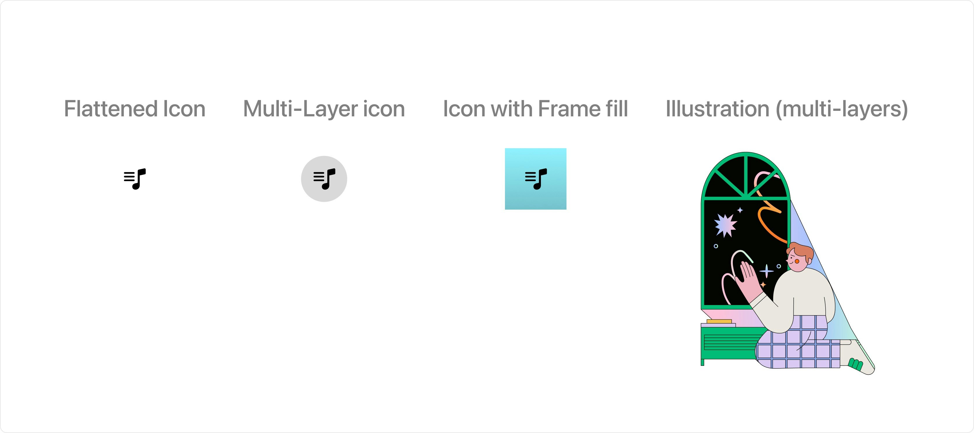 All vector paths in a frame or group will flatten when imported into Play. Including any background fills. Each SVG in the image below will be a single layer in Play.