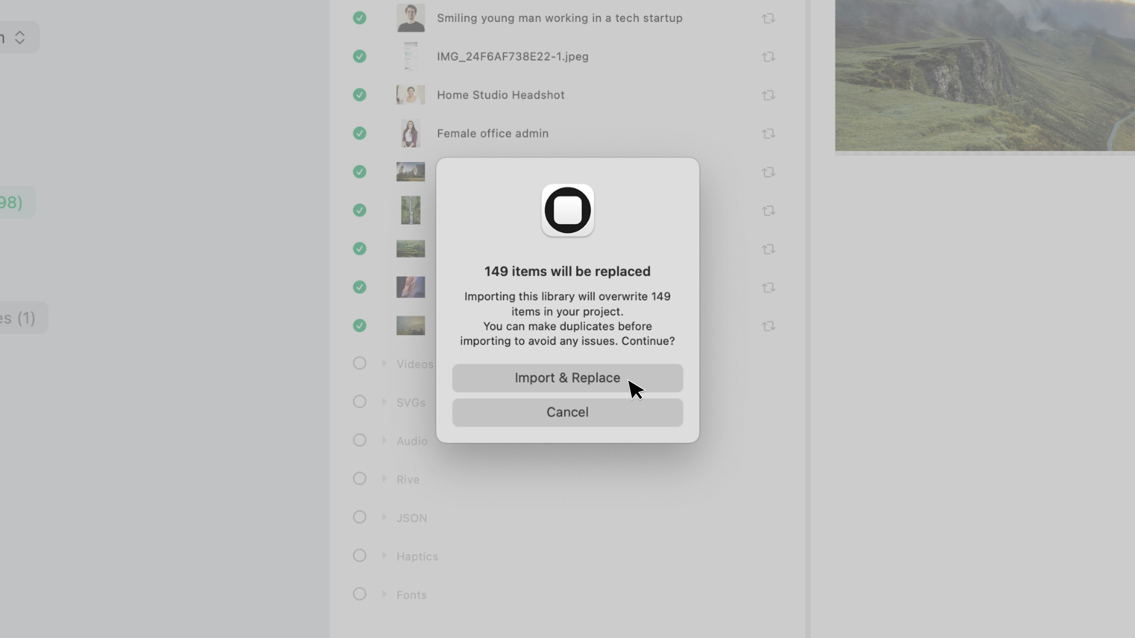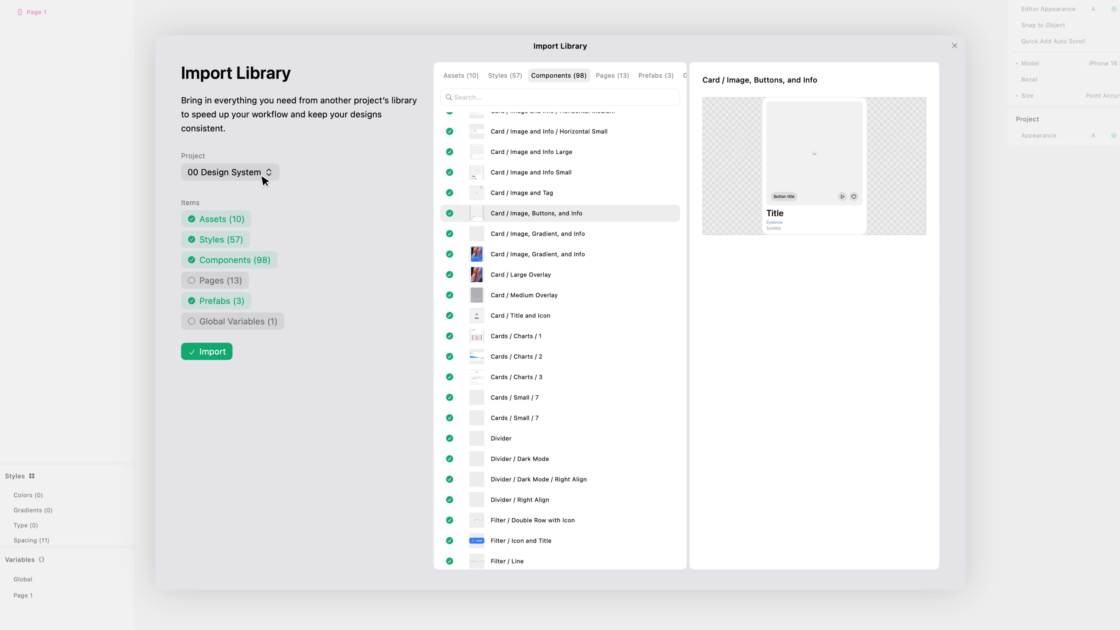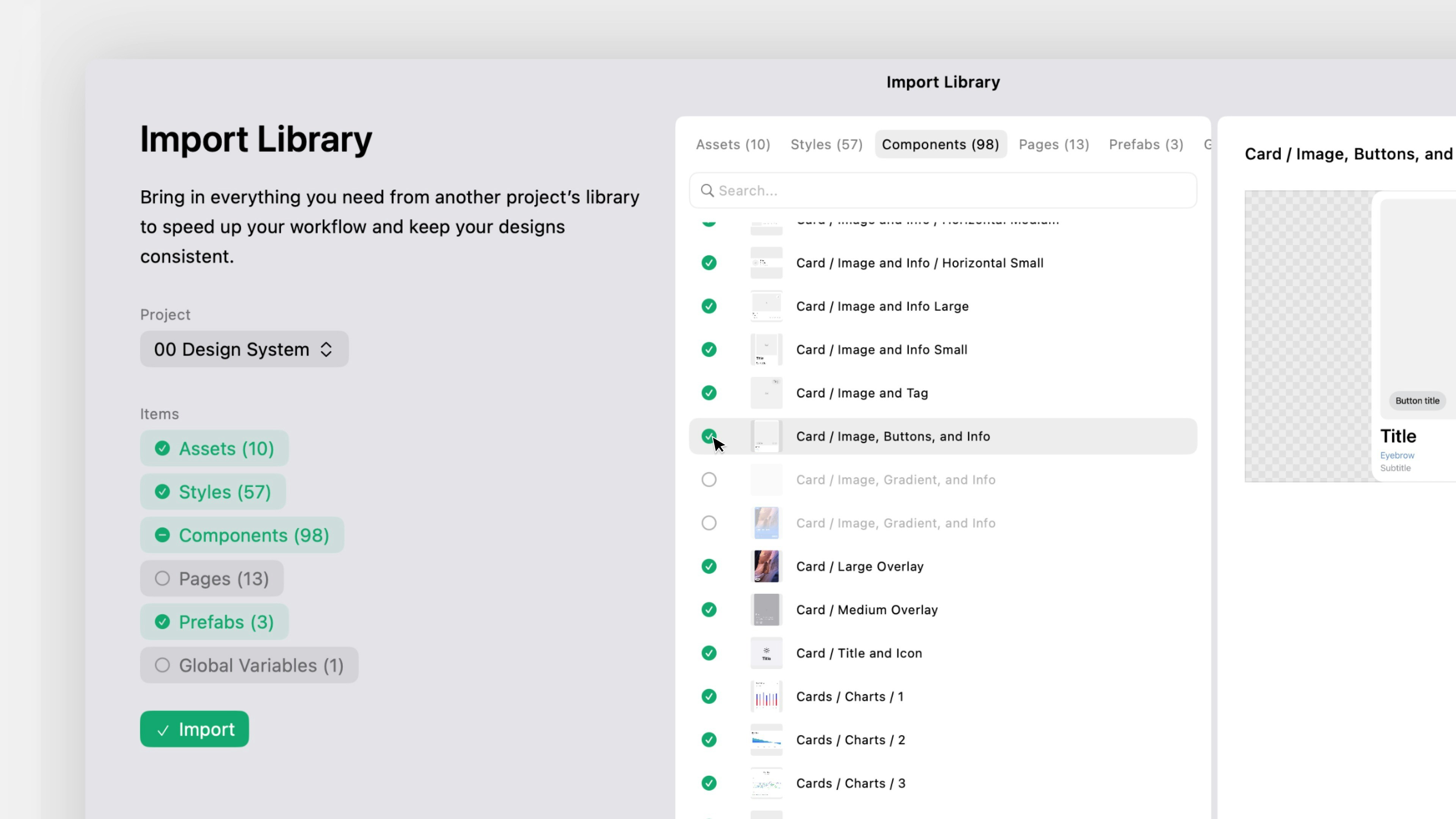 Keep your projects consistent by importing one project’s design system to another project. Importing a project’s library can bring in the assets, styles, components, pages, variables, and custom prefabs from the original project. We recommend creating one “design system” project to be the source of truth imported into working project files.Our Import Library feature is available on our Enterprise plan.