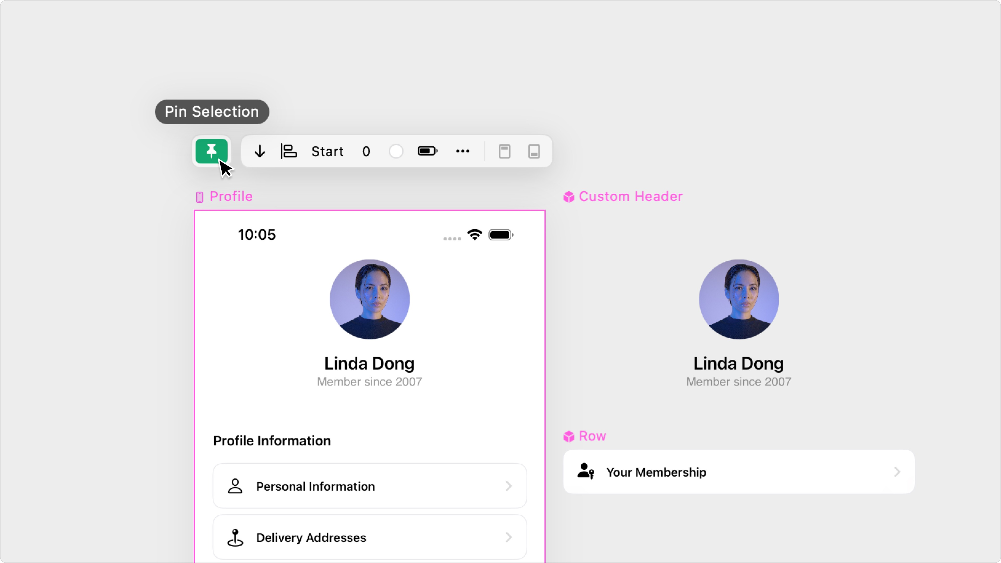 To keep the same view displayed on iOS Play Mode, rather than changing the view based on the selection on macOS, you can lock the selection. In an object’s context bar in Design Mode, just Pin the Selection.