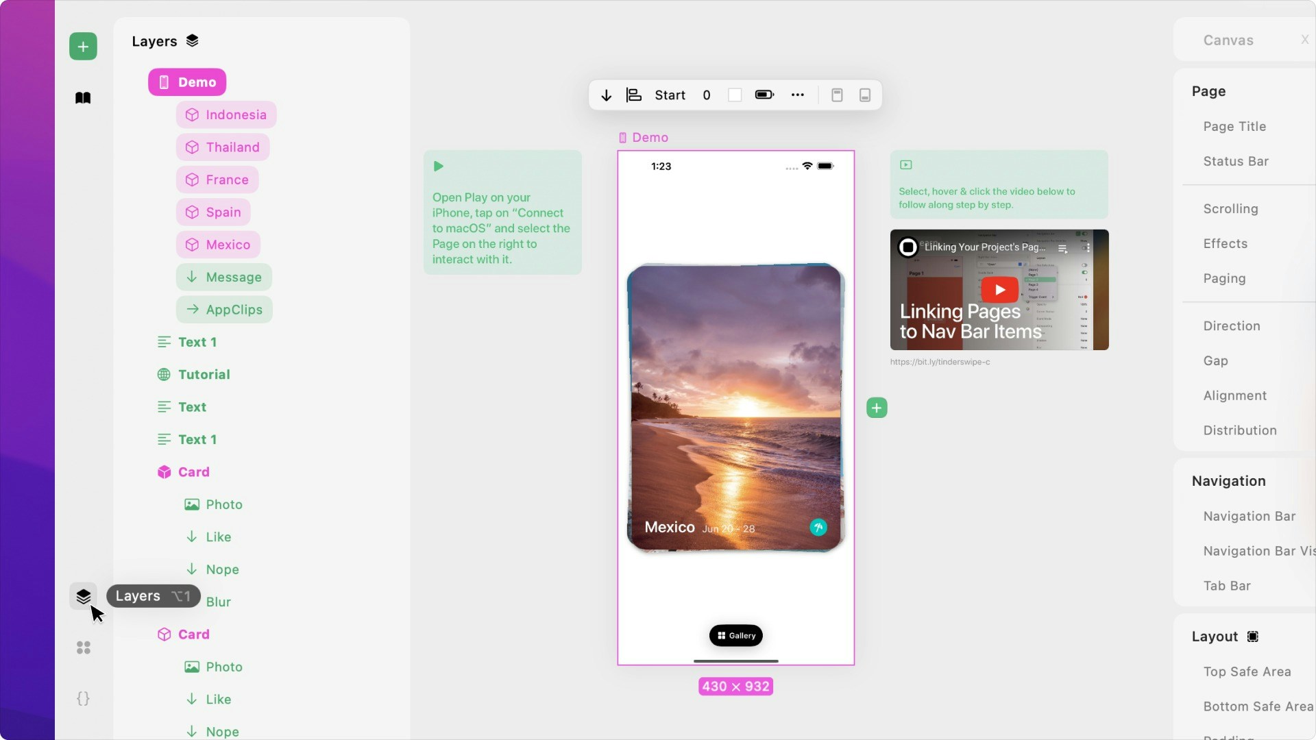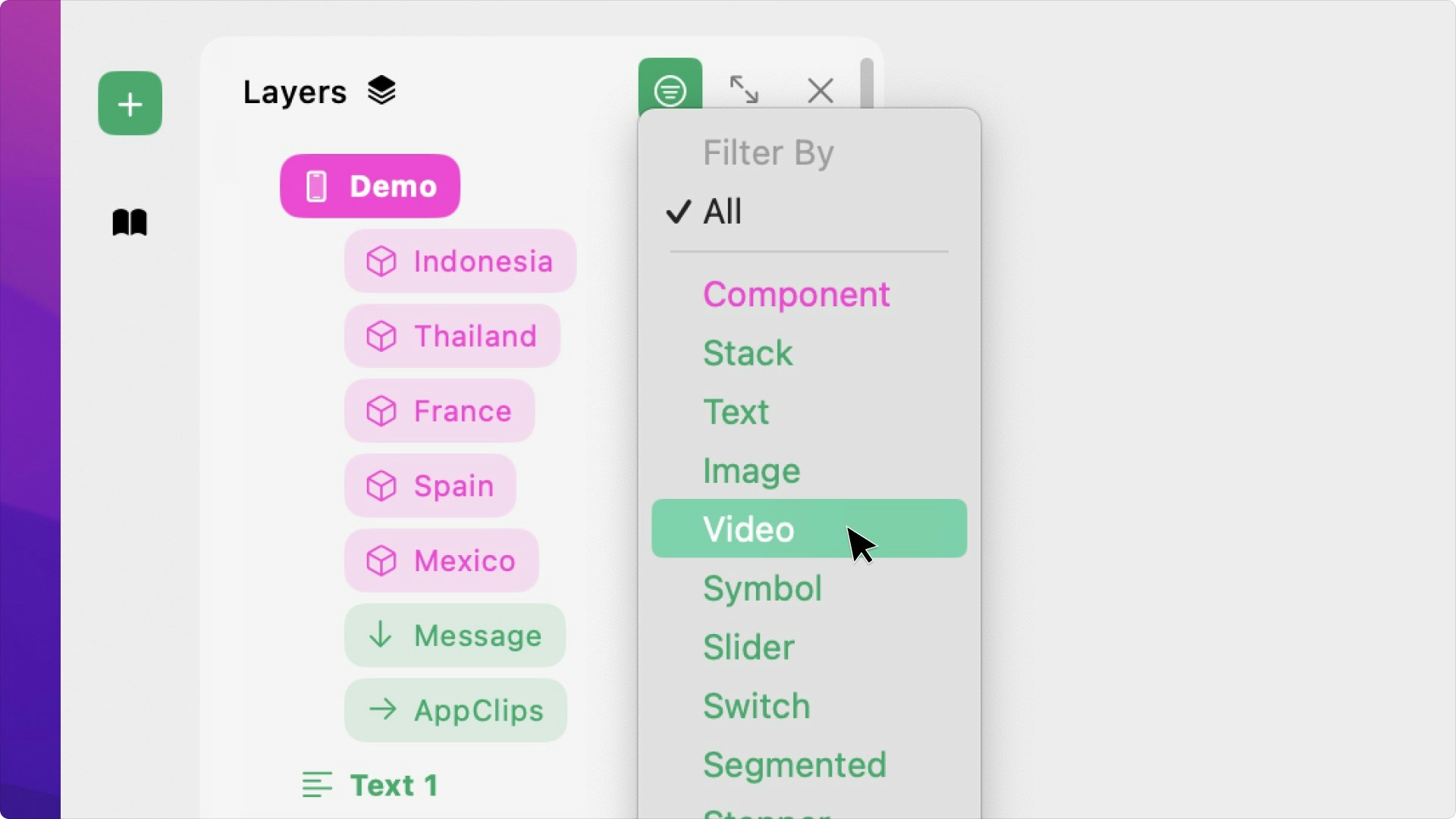 The Layers Panel is a list of each element and component on your page. To select an object, click or tap the object’s name. On macOS, you can reorder objects by dragging their layers to a new position in the Layers Panel. On iOS, close the Layers Panel and use the up and down arrows ion the left side of the Editor. In the future, you’ll be able to reorder objects by dragging them in iOS as well as macOS. Moving an object to a new position will also move its children. If an object has children, they will be indented beneath the object. To collapse or expand all levels of an object’s children, holdOPT and click the layer’s chevron. To collapse or expand all levels of all nodes, hold CMD and click the layer’s chevron.