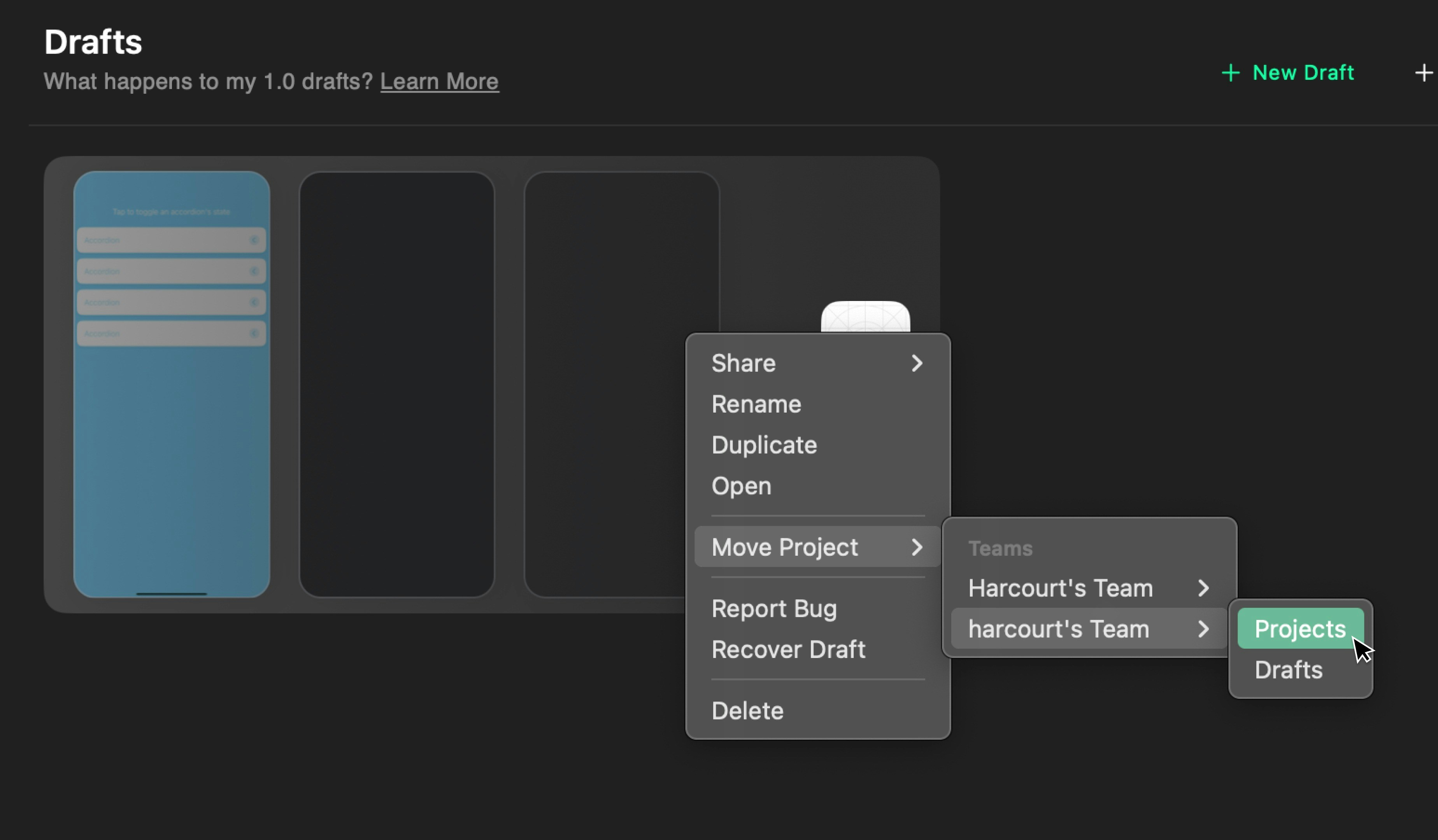 By right-clicking on the project (or draft) and hovering on “Move Projects,” you can move a project (or draft) into any team you’re apart of.