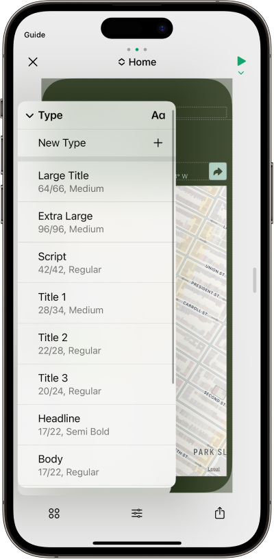 Type styles are the typography options used throughout your project, and they’re specific to each project. Your projects won’t start with any Type Styles, and text elements will instead use Apple’s native System Fonts (and System Styles) by default. Once you’ve created your own Type styles, you can use them for any text element in your project. Play lets you fully customize your Type styles using the following properties:- The Name property is where you’ll name your type style.